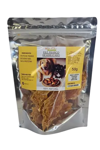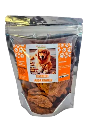 Biscoitos Naturais sabor frango, feitos com proteína de frango, sem conservantes, corantes ou aromatizantes. Pacote com 100g.